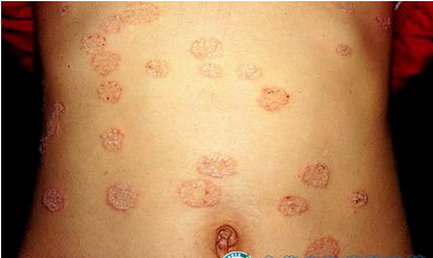 体癣又称“圆癣”或“金钱癣”,是由毛发癣菌、小芽孢菌或表皮癣菌引起。其传染来源主要是手癣,足癣,甲癣及污染的衣着等。潮湿,肥胖,多汗,摩擦,不注意清洁卫生,有糖尿病等及免疫力低下者易于发病。患者常有瘙痒,由于搔抓,局部皮肤呈苔藓样变化。由于病原菌的不同,其临床表现有所差异,红色毛癣菌引起者,病程较慢,皮损多见于面部躯干行四肢,皮损广,类似播散性神经皮炎表现。
