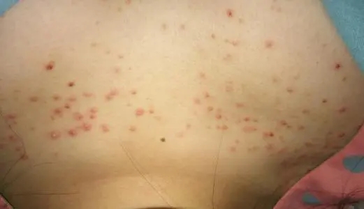 5、毛囊炎:背上长小红疙瘩,还要考虑是毛囊炎的可能性。毛囊炎是由金黄色葡萄球菌感染毛囊引起的炎症,好发于头皮、后颈及胸背部。毛囊炎初起为红色充实性丘疹,皮疹数目多,但不融合,以后迅速发展成丘疹性脓疮。基本损害呈与毛囊一致的红色丘疹,其中心有毛发贯穿,顶端迅速化脓形成脓点,周围绕以红晕。以后排出少量脓液,继而干燥、结痂,痂脱不留痕迹,患者会自觉瘙痒或轻度疼痛。