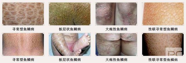 寻常型鱼鳞病:主要表现在四肢伸侧和躯干的燥性褐色菱形,或多角性鳞屑,上臂及大腿伸侧常有明显的毛囊角化性丘疹,掌趾受累。发病率很高,其角化性鳞屑是数层角质细胞不脱落堆积所致,多于出生后数月出现,5岁左右最重,青春期后症状可能减轻但随着年龄的增大和治疗不当病情加重。