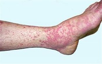 1、皮肤症状:以下肢大关节附近及臀部分批出现对称分布、大小不等的斑丘疹样紫癜为主,紫癜可突出皮面、伴轻微痒感,初为鲜红色,继而为暗红色、褐色。