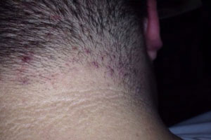 1、毛囊炎:毛囊炎是由金黄色葡萄球菌感染毛囊引起的炎症,好发于头皮、后颈及胸背部。毛囊炎初起为红色充实性丘疹,皮疹数目多,但不融合,以后迅速发展成丘疹性脓疮。基本损害呈与毛囊一致的红色丘疹,其中心有毛发贯穿,顶端迅速化脓形成脓点,周围绕以红晕。