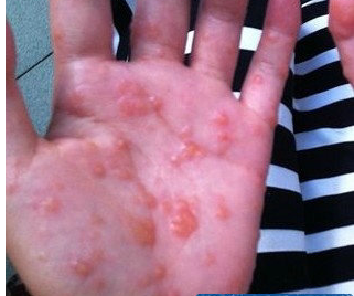 水疱内含澄清浆液,一般不自行破裂,干涸后形成脱皮,露出红色新生上皮,薄而嫩,此时常感疼痛。周围皮肤正常。