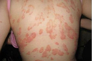 2、银屑病:银屑病,俗称牛皮癣,是一种常见的具有特征性皮损的慢性易于反复的炎症性皮肤病。初起为炎性红色丘疹,约粟粒至绿豆大小,以后逐渐扩大或融合成为棕红色斑块,边界清楚,周围有炎性红晕,基底浸润明显,表面覆盖多层干燥的灰白色或银白色鳞屑。轻轻刮除表面鳞屑,逐渐露出一层淡红色发亮的半透明薄膜,称薄膜现象。