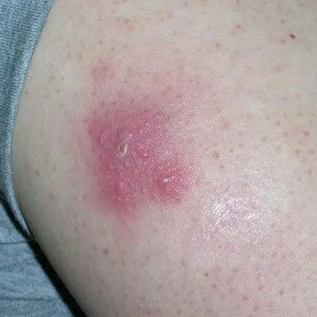 6、传染性湿疹样皮炎:本病为自身敏感性皮炎的特殊型,在发生前患处附近有慢性细菌性感染病灶,临床以病灶周围发红、密集小水疱、水疱、脓疱、 结痂、鳞屑、红疙瘩为特征。发病前有慢性细菌感染灶,排出大量分泌物。